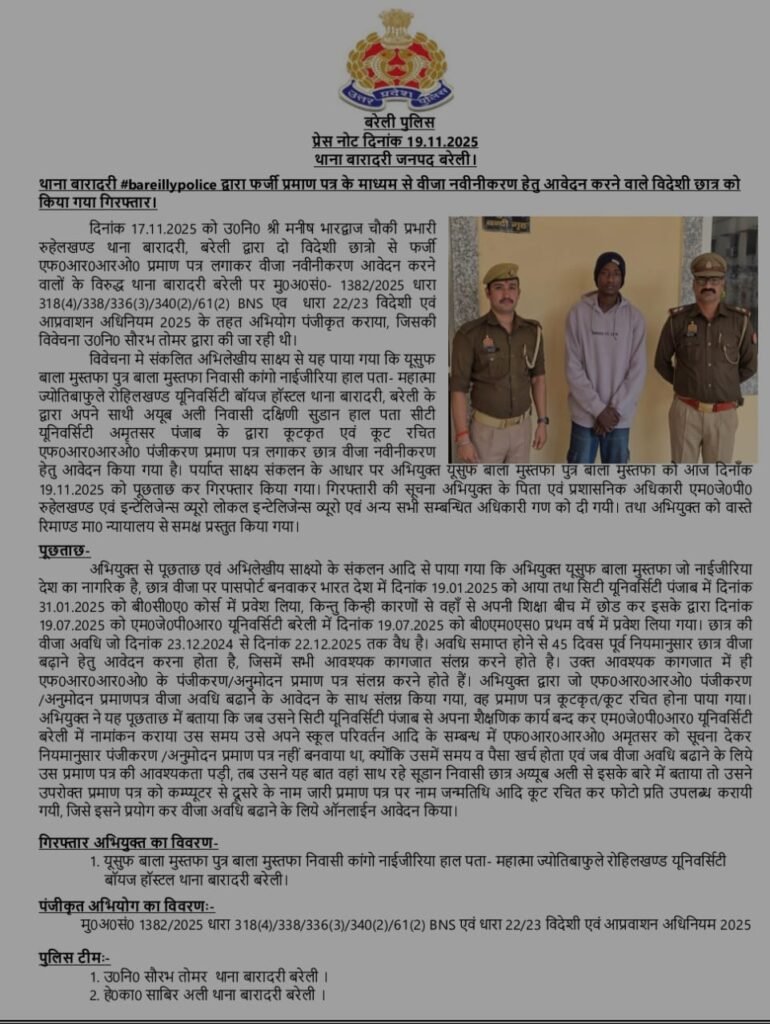 बरेली में वीज़ा अवधि बढ़ाने के लिए फर्जीवाड़ा करने वाले नाइजीरिया के छात्र युसूफ बाला को बारादरी पुलिस ने बुधवार को कड़ी सुरक्षा में न्यायिक मजिस्ट्रेट के कोर्ट में पेश किया, जहां से उसे जेल भेज दिया गया। मामले में उसके साथी छात्र अयूब की गिरफ्तारी के लिए पुलिस की टीम गुरुवार को पंजाब रवाना होगी। कुछ औपचारिकताएं पूरी न होने के कारण बुधवार को टीम नहीं जा सकी..