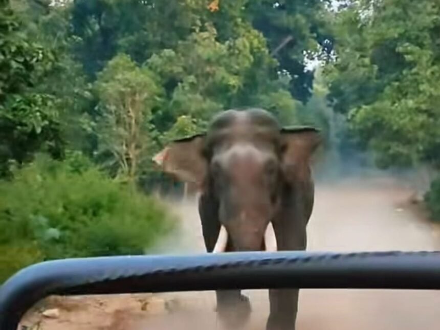 बिजनौर : टाइगर रिजर्व में जंगल सफारी कर रहे पर्यटकों की जिप्सी के पीछे दौड़ा ईक्कड हाथी