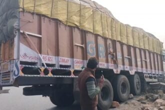 सोनभद्र : तेज रफ्तार ट्रक अनियंत्रित होकर पहाड़ से टकराई।