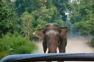 बिजनौर : टाइगर रिजर्व में जंगल सफारी कर रहे पर्यटकों की जिप्सी के पीछे दौड़ा ईक्कड हाथी
