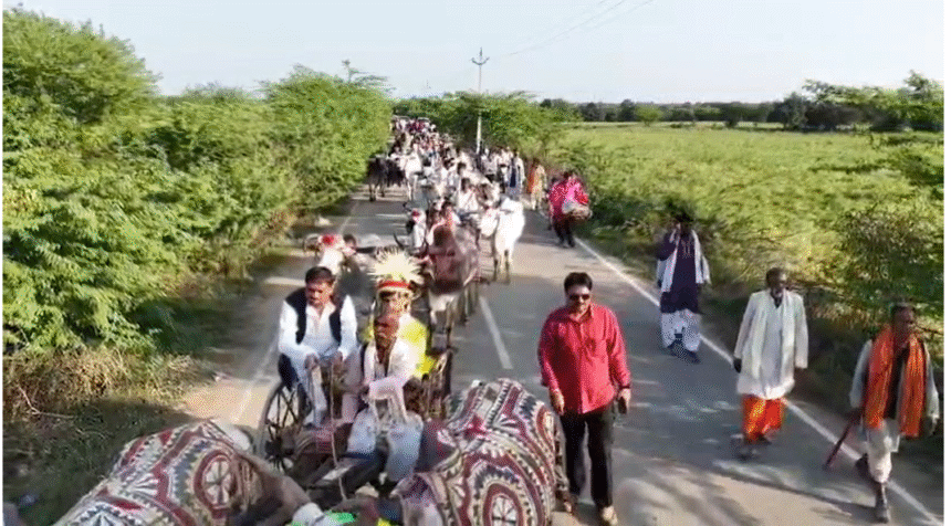 हमीरपुर के मौदहा कोतवाली क्षेत्र के गुडा गांव में शादी का एक अनोखा दृश्य देखने को मिला, जिसने पूरे इलाके का ध्यान अपनी ओर खींचा। दूल्हा मोहित द्विवेदी अपनी बारात के साथ पारंपरिक अंदाज में दुल्हन मोहिनी के घर पहुंचा। खास बात यह रही कि यह बारात 25 सजी-धजी बैलगाड़ियों में सवार होकर तीन किलोमीटर दूर से आई। लगभग 200 बाराती ढोलक और नगाड़ों की थाप के साथ बैलगाड़ियों में सवार होकर दुल्हन के घर पहुंचे।