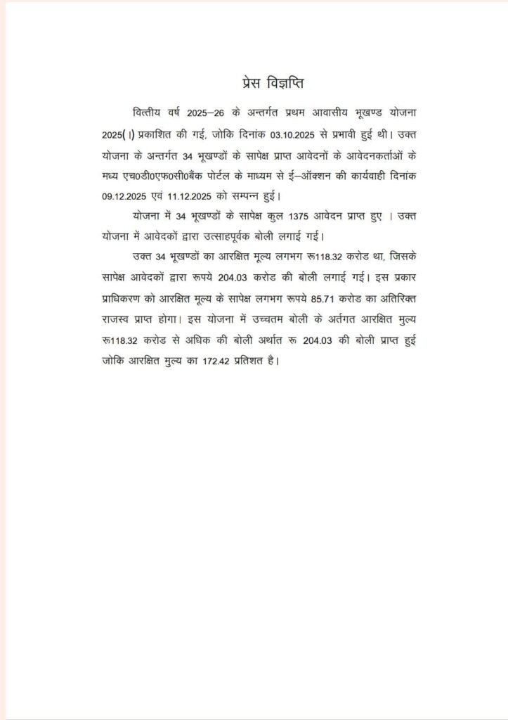 कुल 34 भूखंडों की नीलामी में प्राधिकरण को 85.71 करोड़ रुपये की अतिरिक्त आमदनी हुई,